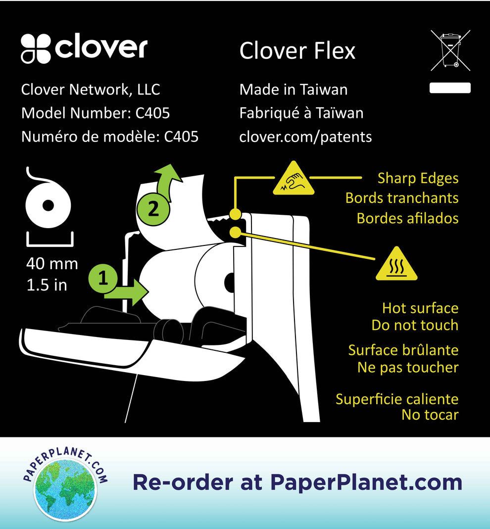 Our bright white thermal receipt paper is heat-sensitive and provides clean, smudge-free prints. Each roll is inspected for quality and features a pink warning mark for low paper. These rolls are specifically guaranteed to fit Clover Flex models C400, C401, and C405, and offer more prints per roll than standard options. Manufactured with high-quality, BPA-free materials, Paper Planet prioritizes consumer and environmental safety. To maintain quality, store in a cool, dark place, away from oil, plastics, chemicals, and fat.